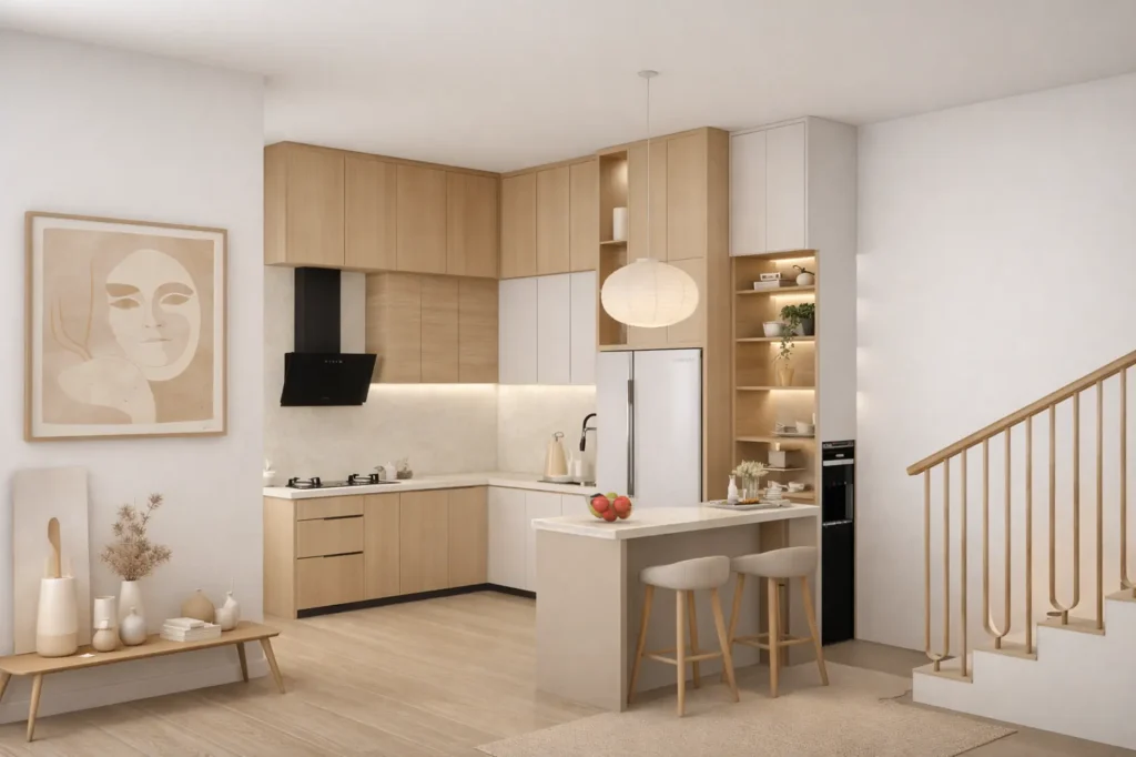 Estimasi kitchen set custom mulai dari Rp 2,5 – 5 juta per meter lari (tergantung material).